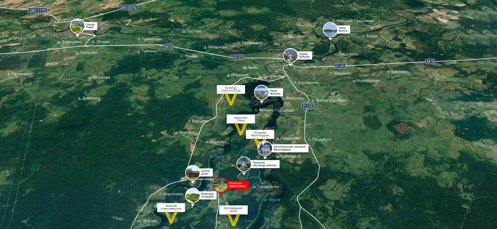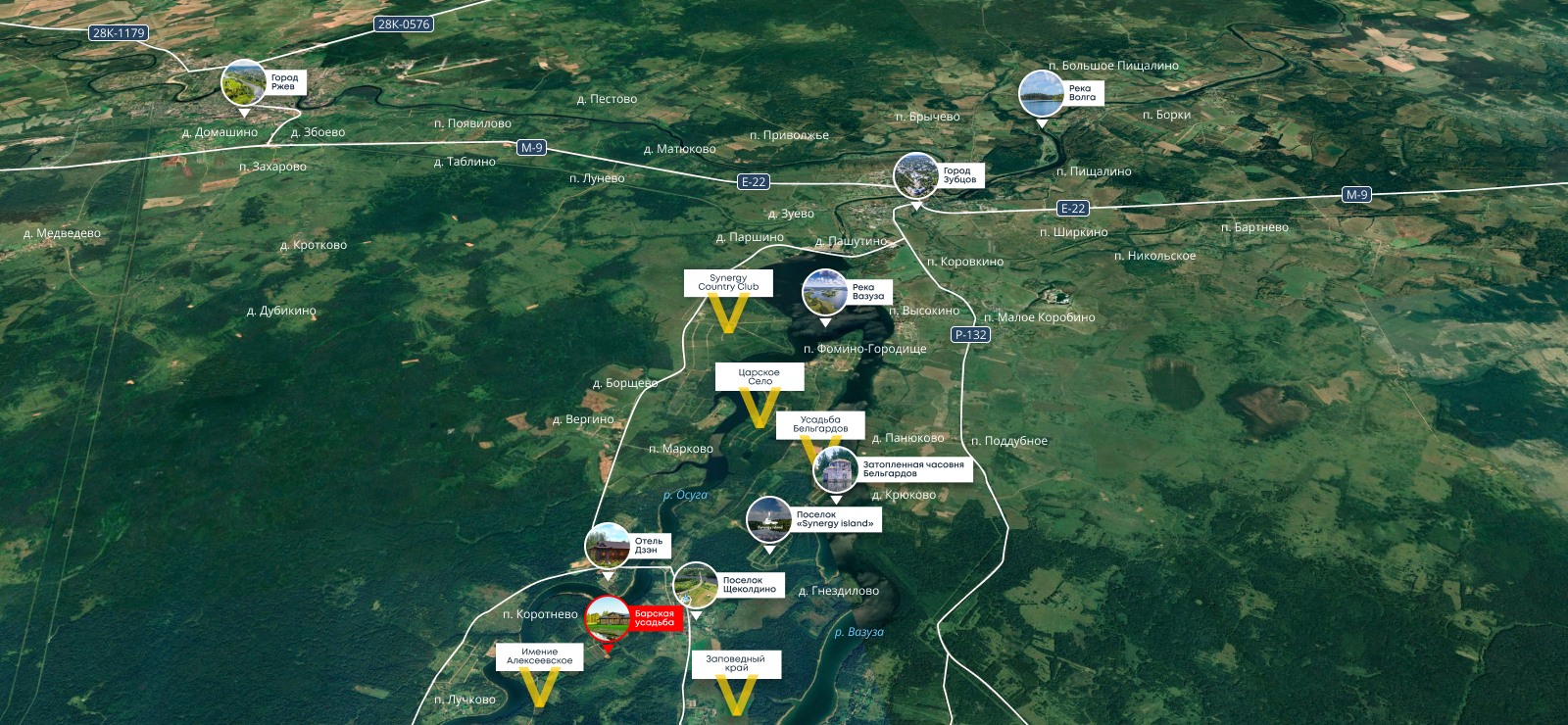 Проект расположен на полуострове Вазузского водохранилища. Уединенность этого места удачно сочетается с транспортной доступностью: 2 часа от Москвы по скоростному Новорижскому шоссе. Участки площадью от 10 соток, собственный выход к воде, запроектированы гостевые дома, детские и спортивные площадки, пляж.